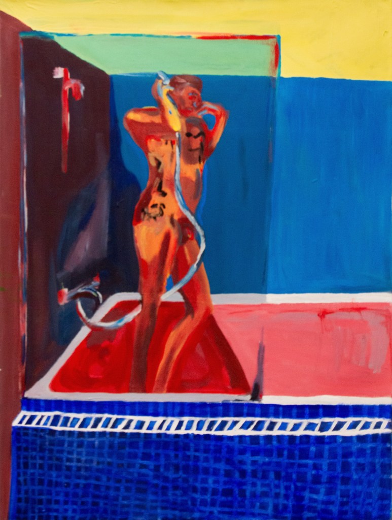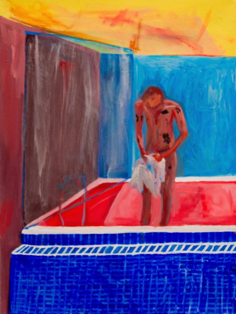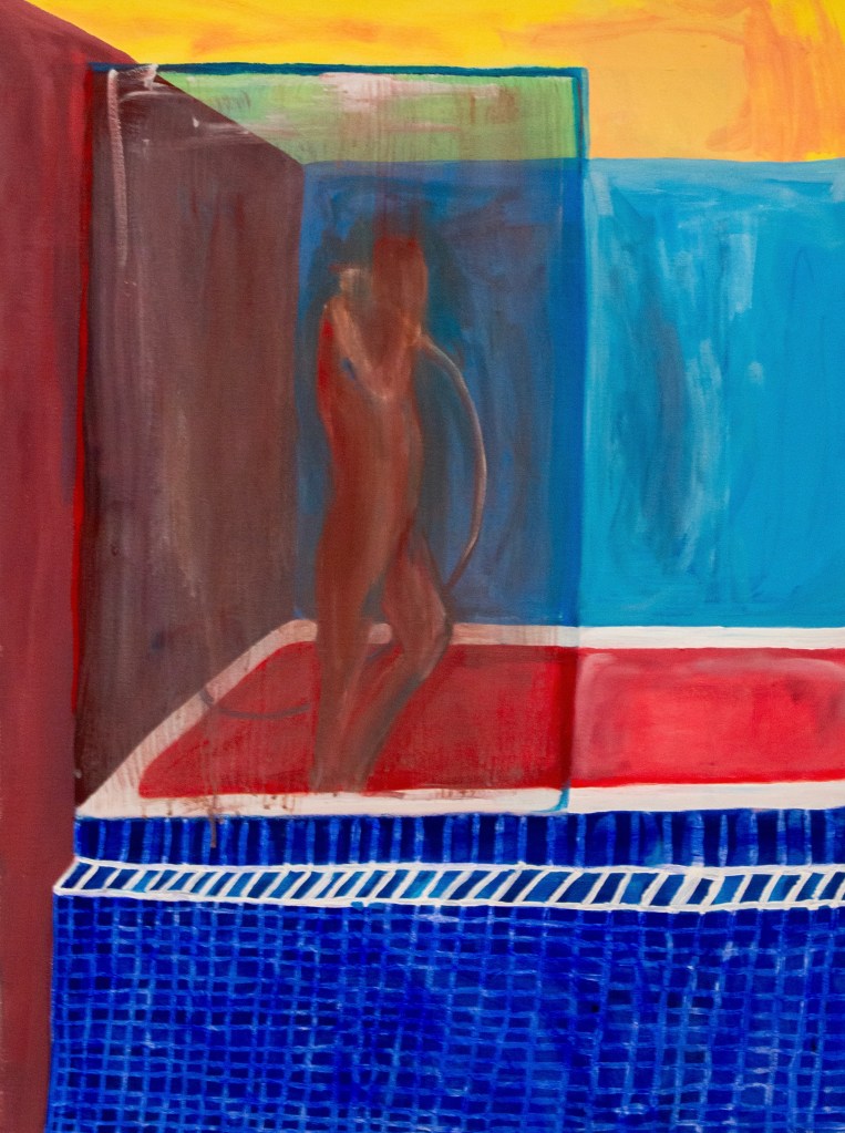 under prossesen av å dusje litt for lenge fikk det meg til å tenke på temaer som vannmangel og sløsing. vanligvis dusjer jeg ikke så lenge,m men jeg ville eksperementere med å se hvor lenge jeg gidder å dusje før jeg kjente meg skikkelig lei. jeg tok også inspirassdjon fra maleren David hockney der han maler mye bassenger, men ikke minst denne rene akryl paletten sin.