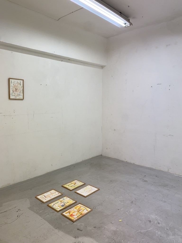 Utstillingen består av en sammensetning av akvareller i et A4 format og olje malerier i ulike størrelser på upreparert lerret. Akvarellene er døpt etter 6 ulike rom, mens olje maleriene har fått navn etter møbler.