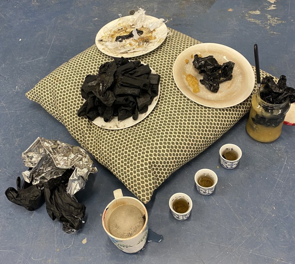 Plastic gloves, pillow, plates, cutlery, glue, apple jam, water, ceramics and aluminium.
